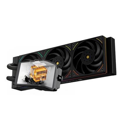TUF Gaming LC III 360 ARGB LCD all-in-one liquid CPU cooler with pre-installed & integrated triple fans designed for high airflow and static pressure; 2.8" LCD for hardware monitoring, custom GIFs and MP4 video clips