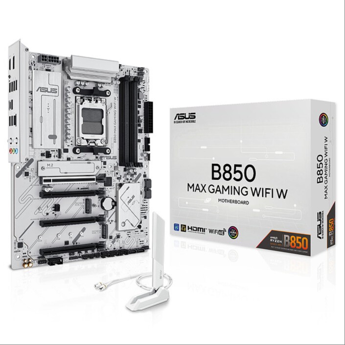 B850 MAX GAMING WIFI W is an ATX motherboard from ASUS that uses the AMD B850 chipset and supports AMD Ryzen 9000, 8000, and 7000 series processors on the AM5 socket. It is a white-colored board designed for gaming and high-performance PC building.